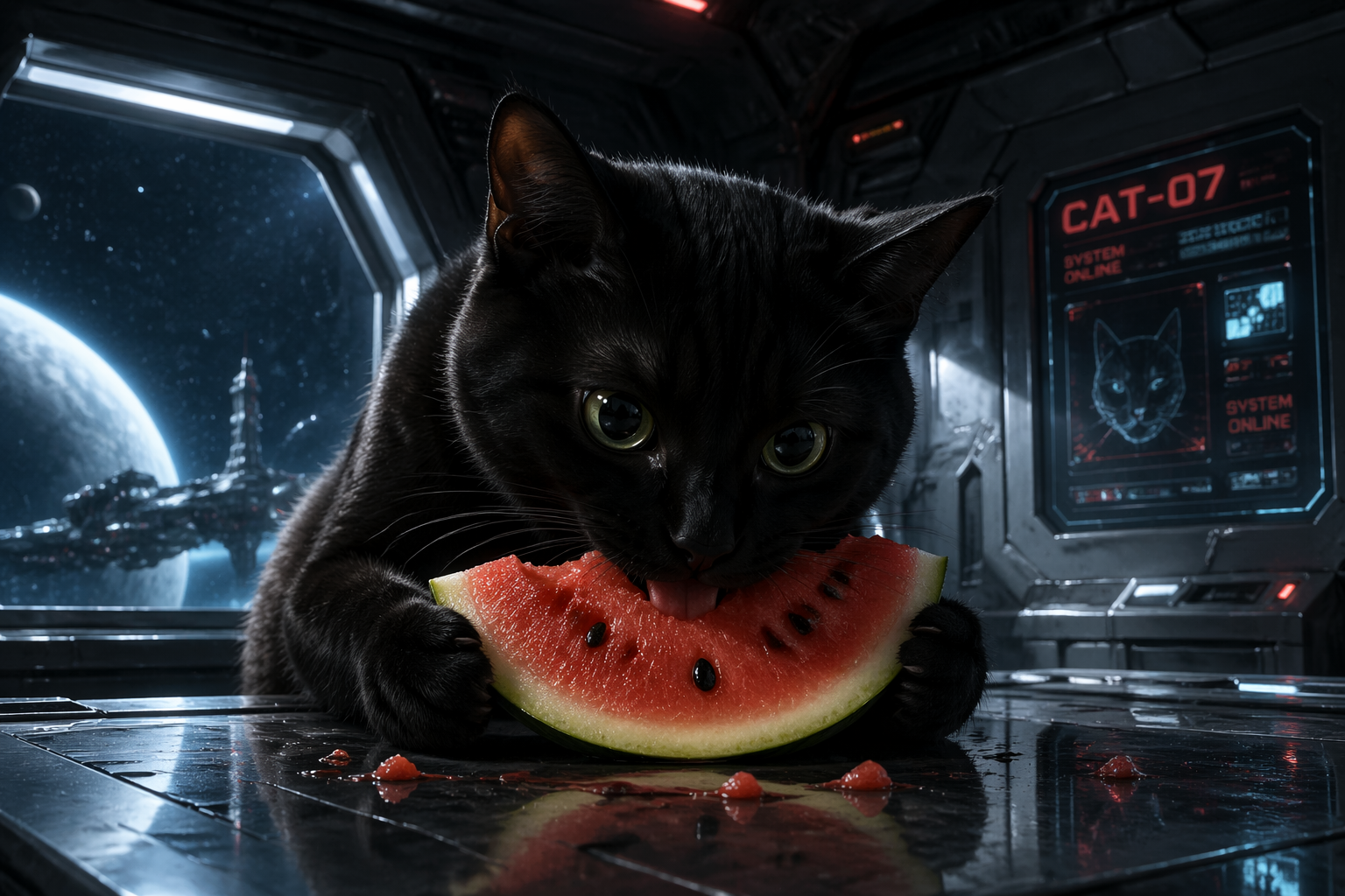 画一只黑色的猫在吃西瓜 科幻电影风格